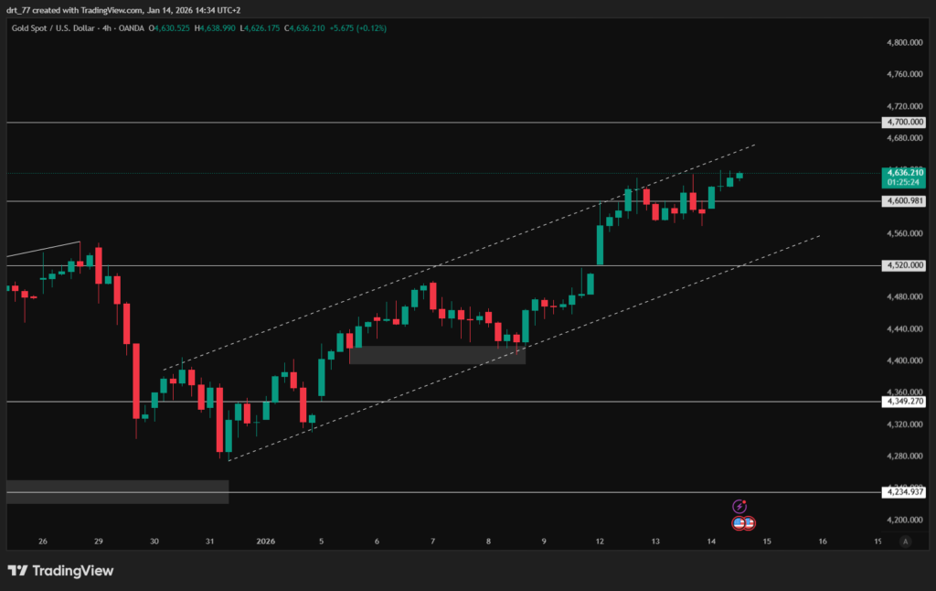 Trên khung thời gian 4 giờ, vàng vẫn được hỗ trợ vững chắc bởi một đường xu hướng tăng đã dẫn dắt giá kể từ đầu tháng 12. Chuỗi các... đỉnh cao hơn và đáy cao hơn Vẫn giữ nguyên, cho thấy một cấu trúc thị trường tăng giá rõ ràng.